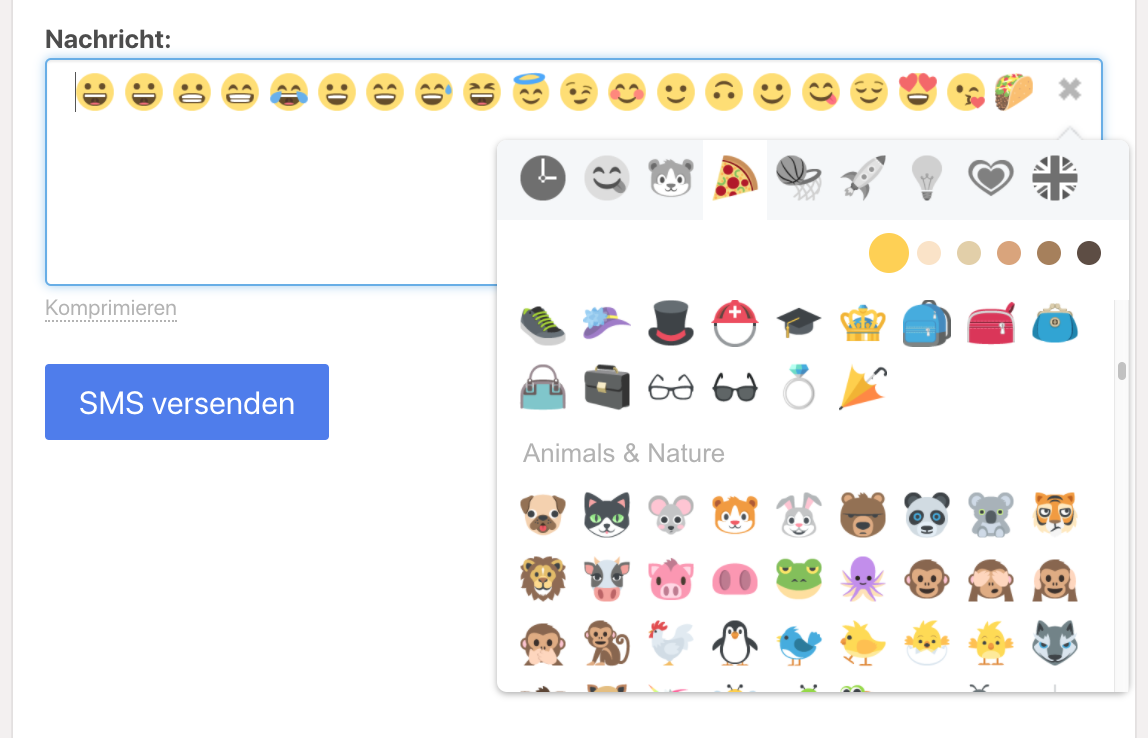 Unser Gateway unterstützt Emojis vollständig. Sie können hierzu in der Webapp im SMS-Formular entsprechende Emojis direkt per Copy&Paste aus einer anderen Anwendung einfügen oder über den Emoji-Button rechts oben im SMS-Textfeld auswählen.