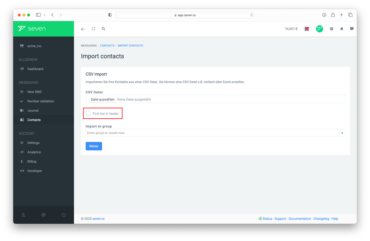 Under Contacts -> More -> Import you can select and upload your CSV file. Here, you also have the possibility to assign the whole CSV file to a single group. If you have only specified the column names in the first row of your CSV file, you can now select "First line is header". If you do, no contact will be created for the first row.