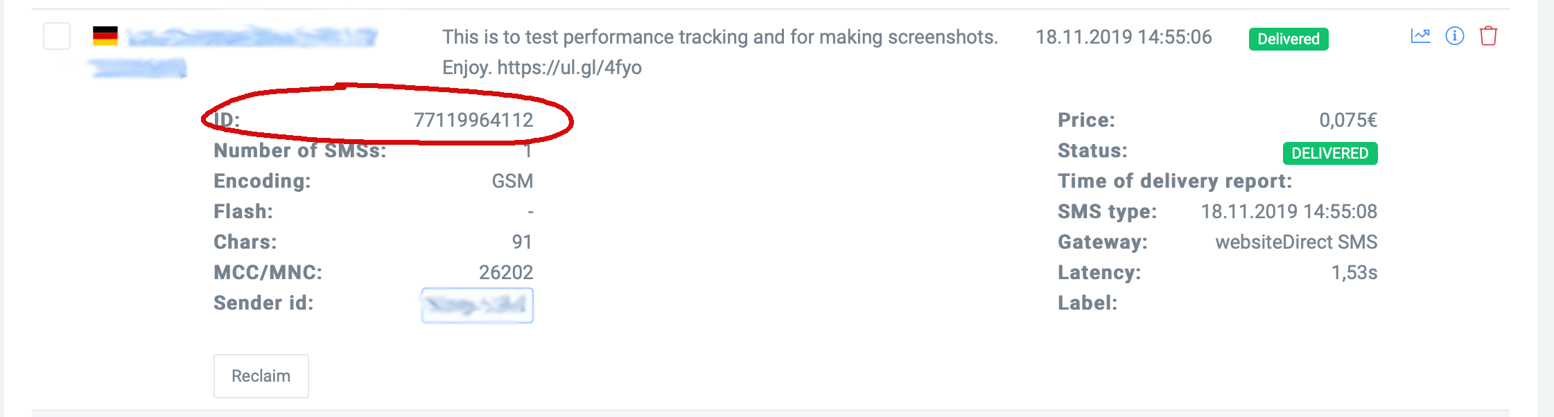If you have looked into why your SMS did not arrive, you can issue a complaint about your SMS in your logbook in the account at any time. To do this, please click on the information icon next to the respective SMS and then on Reclaim. Our technical department will then see the data of the respective SMS. Therefore, we can intervene accordingly and, if applicable, give you a refund.